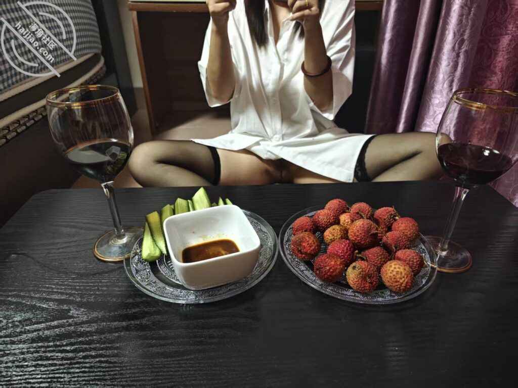老婆提议喝一杯,我们没有下酒菜,就切了一个黄瓜,装了一盘荔枝。老婆内裤都没有穿我们就这样喝上了,这里就拍了照片,忘记把这段录进去。老婆后来还笑我不适合拍视频。。。。。。吃饱喝足就上床,结果不尽人意,老婆说这是我们最糟糕的一次爱爱。